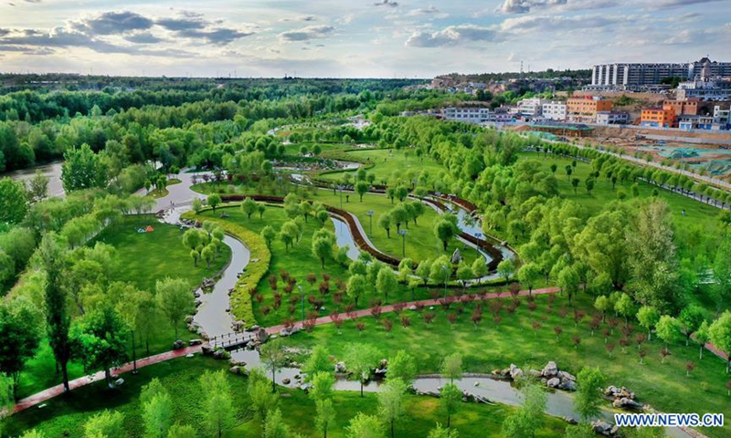 Aerial photo taken on May 24, 2020 shows citizens enjoying leisure time at a green belt along Yuxi River in Yulin City, northwest China's Shaanxi Province. Yulin City, which used to suffer from severe soil erosion and desertification, has been making efforts on afforestation since April, 2017. In November of 2019, the city was granted the status of National Forest City. (Xinhua/Tao Ming)