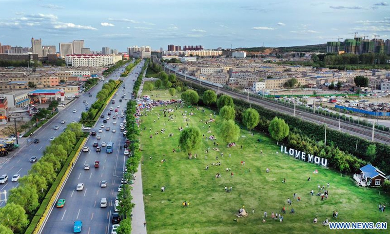 Aerial photo taken on May 24, 2020 shows citizens resting at a green belt in Yulin City, northwest China's Shaanxi Province. Yulin City, which used to suffer from severe soil erosion and desertification, has been making efforts on afforestation since April, 2017. In November of 2019, the city was granted the status of National Forest City. (Xinhua/Tao Ming)