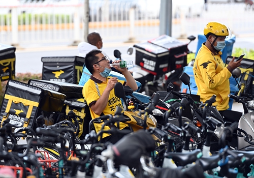 Meituan deliverymen take a break along a road in Beijing on Tuesday. Shares of the Beijing-based food delivery giant ended up 10.41 percent in the Hong Kong market on Tuesday, making it the country's third-largest internet firm by market capitalization, following Alibaba and Tencent. Photo: cnsphoto