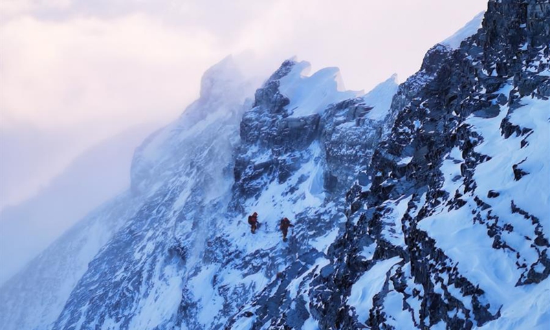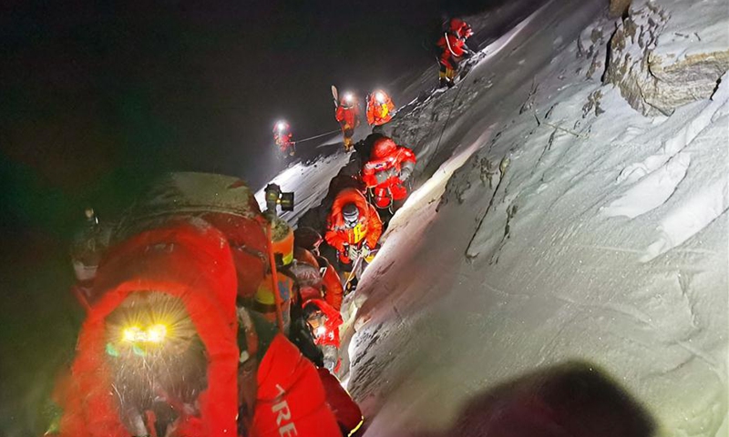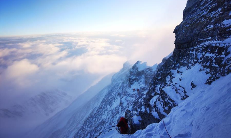 Members of Chinese surveying team head for the summit of Mt. Qomolangma on May 27, 2020. An eight-member Chinese surveying team set off to reach the summit of Mt. Qomolangma, the world's highest peak, from a mountain camp at an altitude of 8,300 meters at around 2:10 a.m. Wednesday. (Xinhua/Penpa)