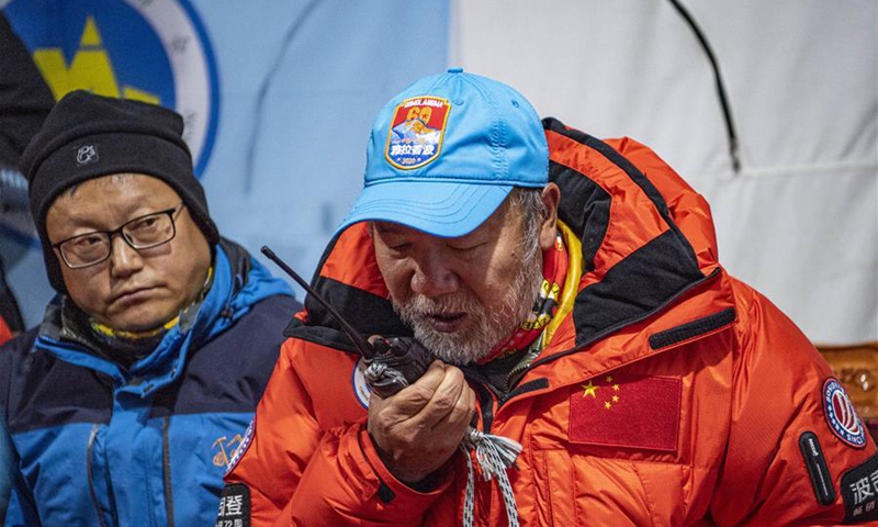 Wang Yongfeng, vice director of the mountaineering administrative center of the General Administration of Sport, speaks to surveying team members at the altitude of 8,300 meters, from the Mount Qomolangma base camp in southwest China's Tibet Autonomous Region, May 27, 2020. An eight-member Chinese surveying team set off to reach the summit of Mt. Qomolangma, the world's highest peak, from a mountain camp at an altitude of 8,300 meters at around 2:10 a.m. Wednesday. (Xinhua/Sun Fei)