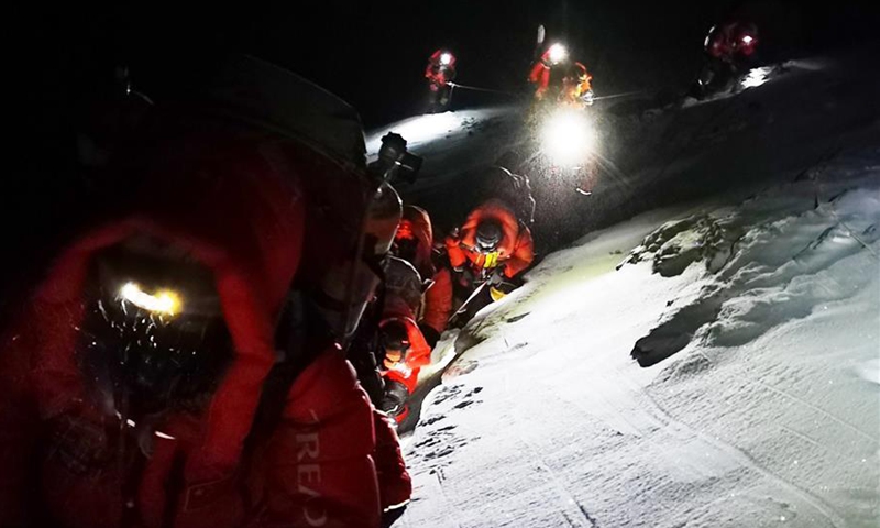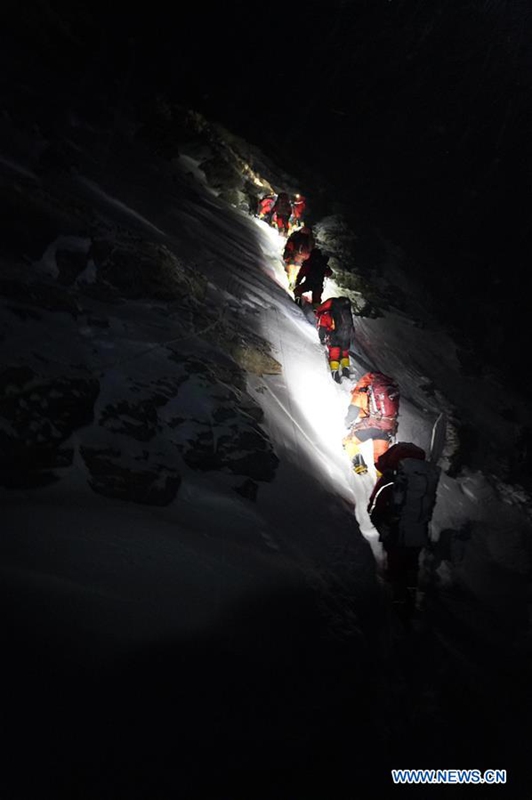 Members of a Chinese surveying team head for the summit of Mt. Qomolangma on May 27, 2020. An eight-member Chinese surveying team set off to reach the summit of Mt. Qomolangma, the world's highest peak, from a mountain camp at an altitude of 8,300 meters at around 2:10 a.m. Wednesday. (Xinhua/Tashi Tsering)