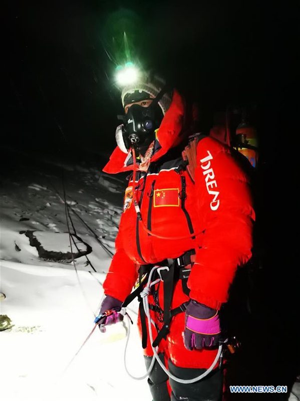 A member of a Chinese surveying team heads for the summit of Mt. Qomolangma on May 27, 2020. An eight-member Chinese surveying team set off to reach the summit of Mt. Qomolangma, the world's highest peak, from a mountain camp at an altitude of 8,300 meters at around 2:10 a.m. Wednesday. (Xinhua/Tashi Tsering)