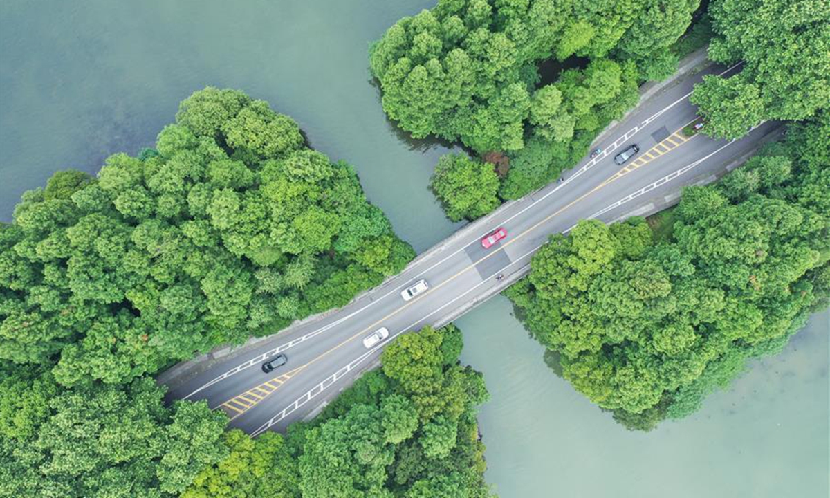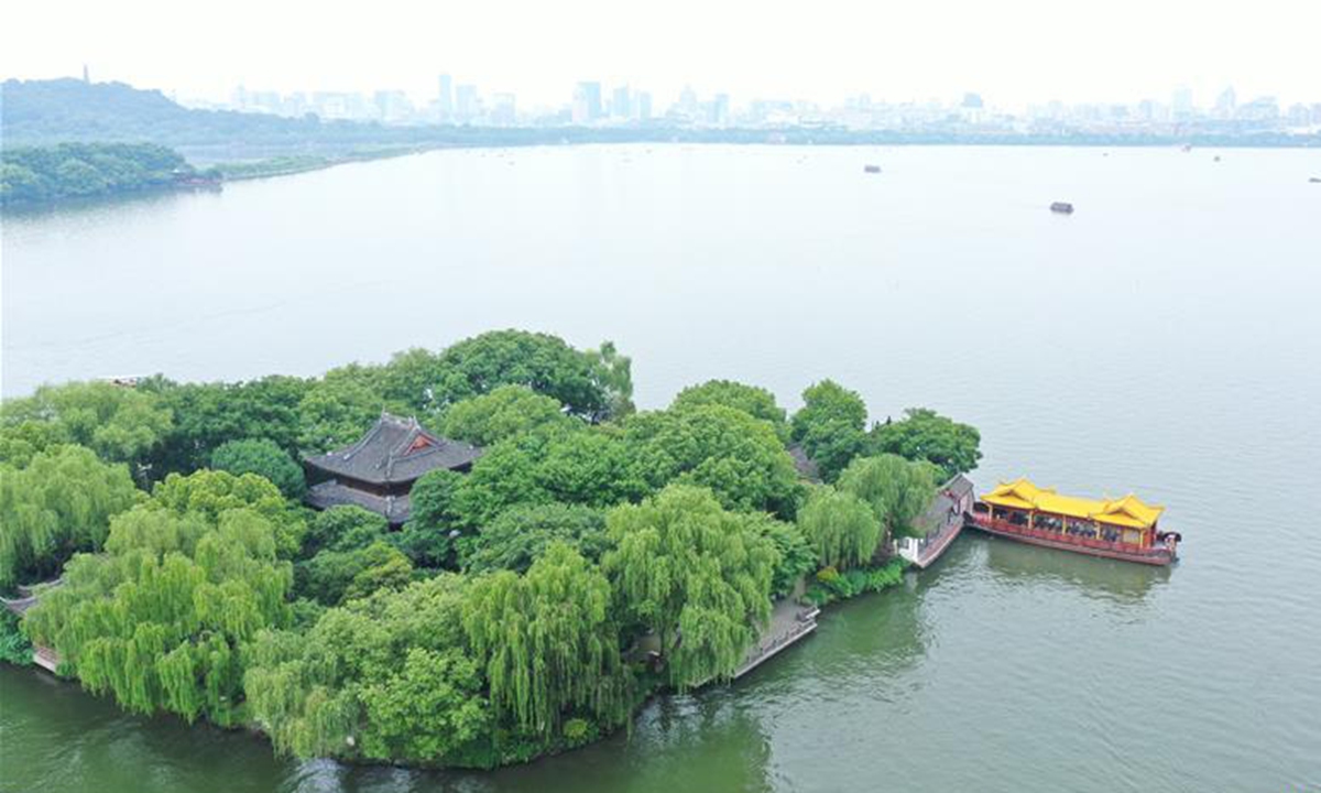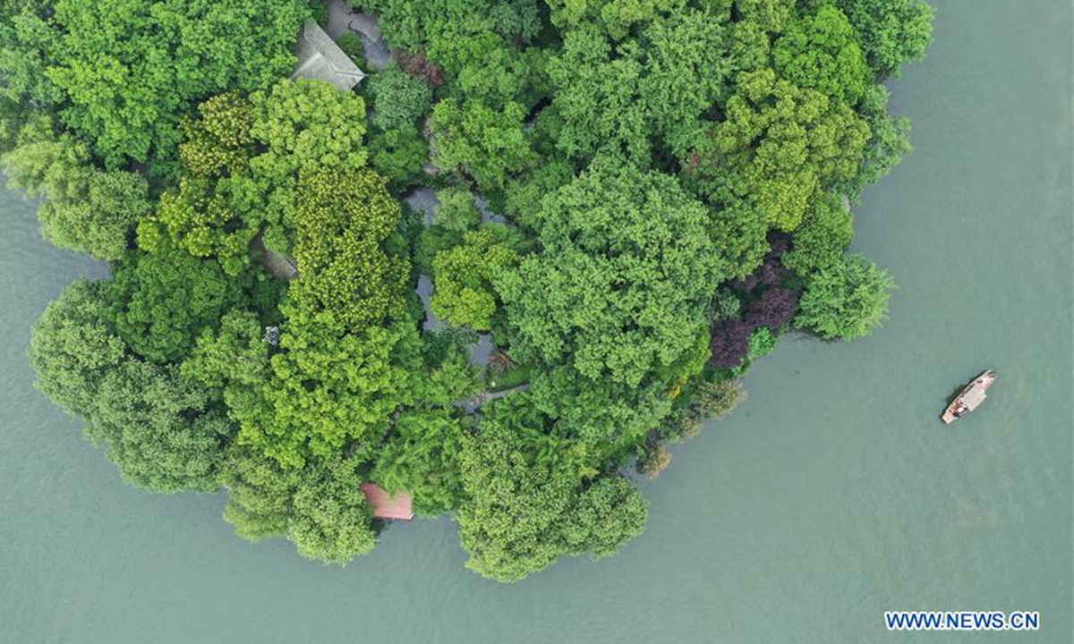 Aerial photo taken on May 27, 2020 shows a boat passing by an island in the West Lake scenic area in Hangzhou, east China's Zhejiang Province. (Xinhua/Weng Xinyang)