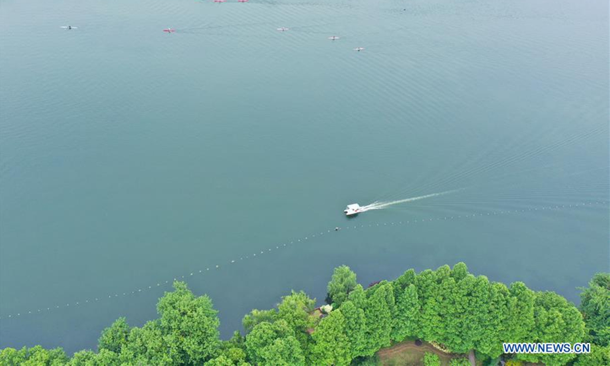 Aerial photo taken on May 27, 2020 shows a boat on the water of the West Lake scenic area in Hangzhou, east China's Zhejiang Province. (Xinhua/Weng Xinyang)