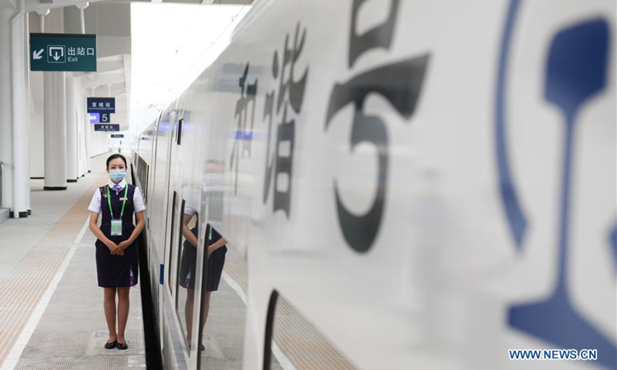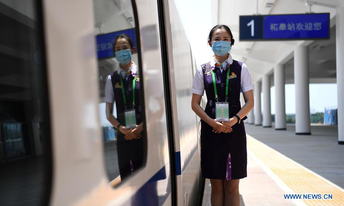 A train attendant poses next to a high-speed train during its trial operation along the Shangqiu-Hefei-Hangzhou High-speed Railway at Xuancheng Railway Station in Xuancheng, east China's Anhui Province, May 27, 2020. The Hefei-Huzhou section of the Shangqiu-Hefei-Hangzhou High-speed Railway entered a trial operation phase on Wednesday. (Xinhua/Zhang Duan)