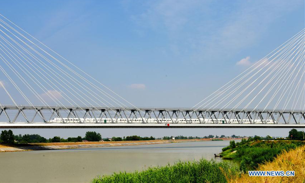 A high-speed train runs on Yuxi River Bridge during its trial operation along the Shangqiu-Hefei-Hangzhou High-speed Railway in Chaohu City, east China's Anhui Province, May 27, 2020. The Hefei-Huzhou section of the Shangqiu-Hefei-Hangzhou High-speed Railway entered a trial operation phase on Wednesday. (Xinhua)