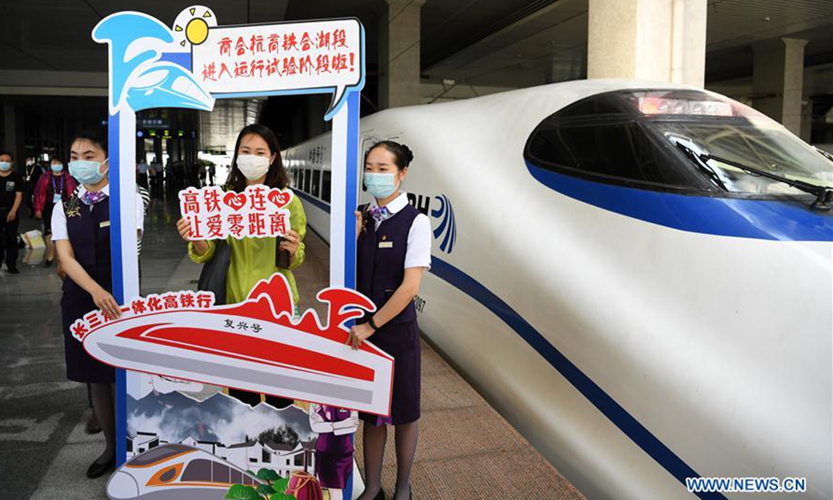 A passenger poses for photos with train attendants in front of a high-speed train during its trial operation along the Shangqiu-Hefei-Hangzhou High-speed Railway at Hefei South Railway Station in Hefei, east China's Anhui Province, May 27, 2020. The Hefei-Huzhou section of the Shangqiu-Hefei-Hangzhou High-speed Railway entered a trial operation phase on Wednesday. (Xinhua/Liu Junxi)