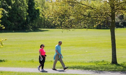 A couple walk in a park in Dublin, Ireland, May 5, 2020. Ireland on Tuesday eased some of its lockdown measures introduced more than a month ago following the COVID-19 outbreak in the country. (Xinhua)