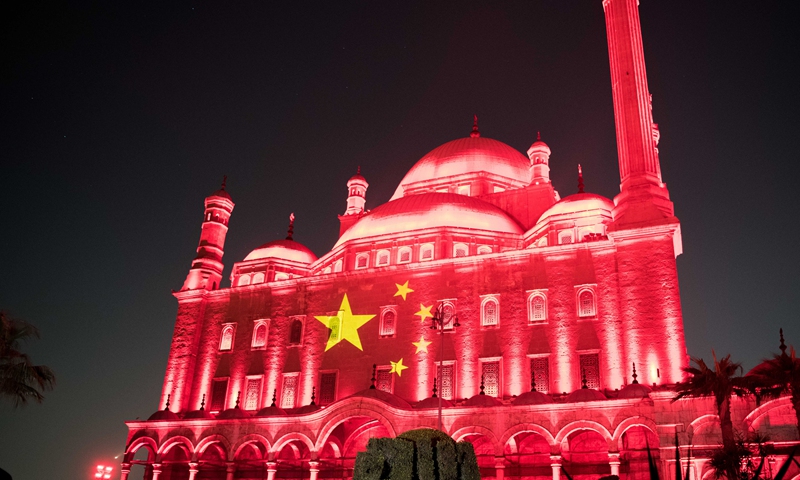 Saladin Citadel is lit up in red and golden stars to resemble the national flag of China as a sign of solidarity in combating the novel coronavirus in Cairo, Egypt on March 1. Photo: Xinhua