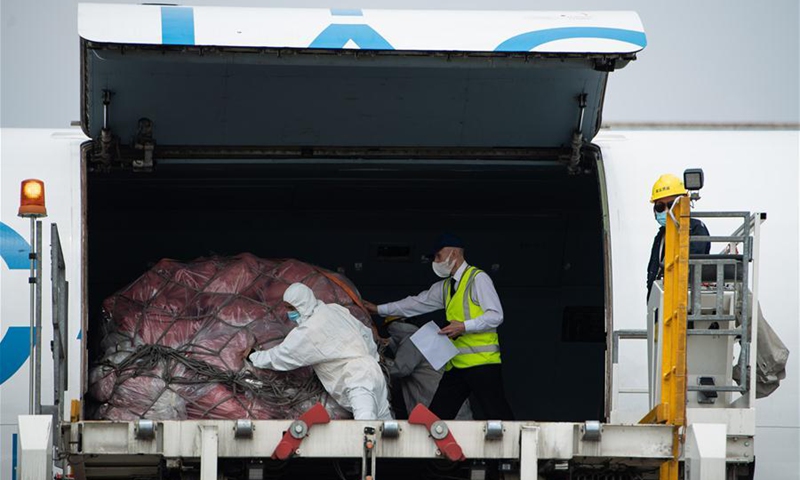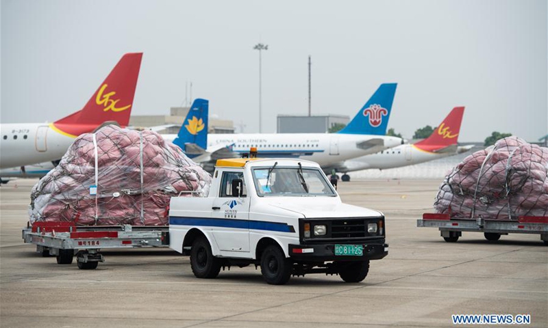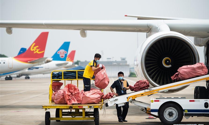 Staff move the parcels from the cross-border e-commerce businesses at the Changsha Huanghua International Airport in Changsha, central China's Hunan Province, May 28, 2020. An airplane carrying almost 40,000 parcels from the cross-border e-commerce businesses departed from Changsha to Moscow, Russia on Thursday. This was the maiden flight of the regular freight air route on the cross-border e-commerce to Russia, signifying the operation of such a route in Hunan. Operated three times a week, the route will serve as a direct link between the e-commerce businesses to Russian consumers, which will shorten the delivery time of commodities made in Hunan from previously over 20 days to about 10 days. (Xinhua/Chen Sihan)