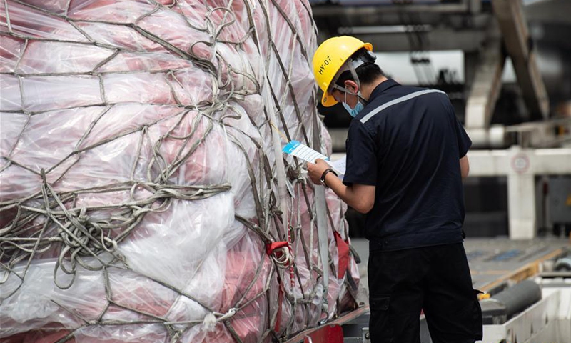 A staff member checks the information of goods at the Changsha Huanghua International Airport in Changsha, central China's Hunan Province, May 28, 2020. An airplane carrying almost 40,000 parcels from the cross-border e-commerce businesses departed from Changsha to Moscow, Russia on Thursday. This was the maiden flight of the regular freight air route on the cross-border e-commerce to Russia, signifying the operation of such a route in Hunan. Operated three times a week, the route will serve as a direct link between the e-commerce businesses to Russian consumers, which will shorten the delivery time of commodities made in Hunan from previously over 20 days to about 10 days. (Xinhua/Chen Sihan)