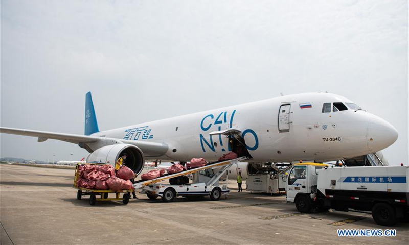 An airplane carrying parcels from the cross-border e-commerce to Russia is seen at the Changsha Huanghua International Airport in Changsha, central China's Hunan Province, May 28, 2020. An airplane carrying almost 40,000 parcels from the cross-border e-commerce businesses departed from Changsha to Moscow, Russia on Thursday. This was the maiden flight of the regular freight air route on the cross-border e-commerce to Russia, signifying the operation of such a route in Hunan. Operated three times a week, the route will serve as a direct link between the e-commerce businesses to Russian consumers, which will shorten the delivery time of commodities made in Hunan from previously over 20 days to about 10 days. (Xinhua/Chen Sihan)