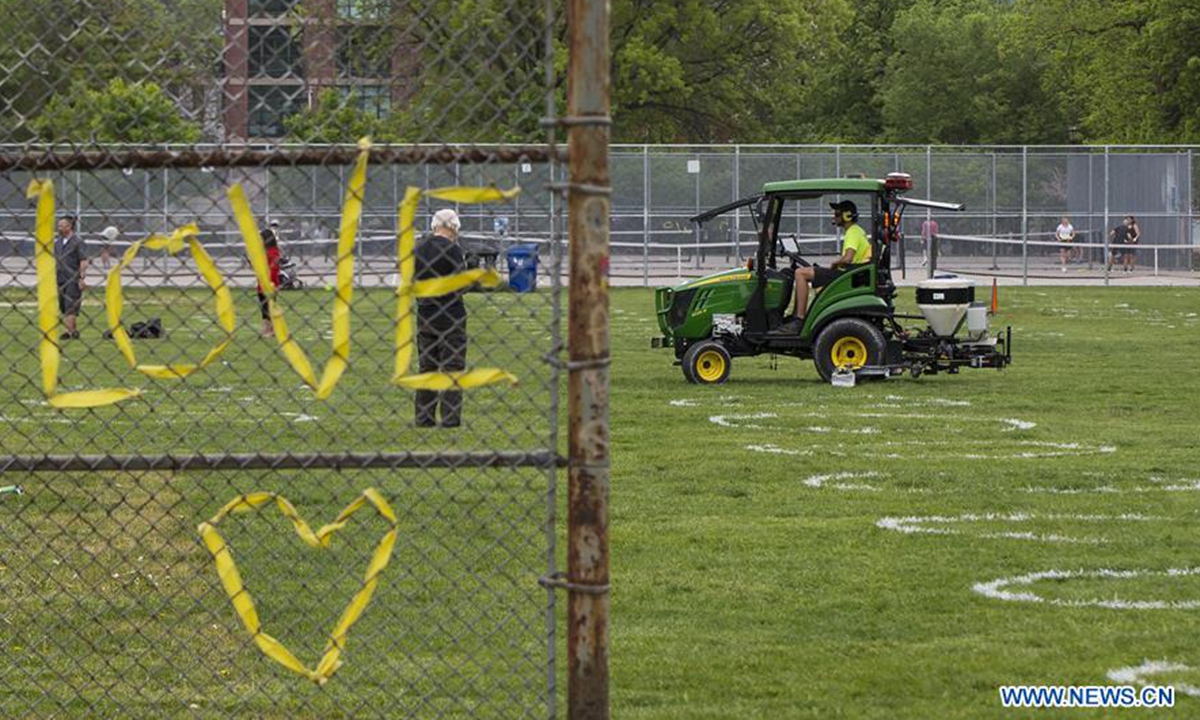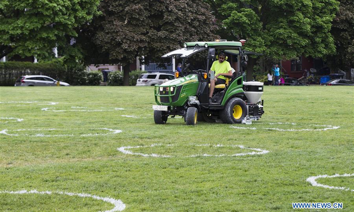 A worker paints a white circle on the grass at Trinity Bellwoods Park in Toronto, Canada, on May 28, 2020. The City of Toronto painted circles on the grass at Trinity Bellwoods Park as a pilot project on Thursday to encourage people in physical distancing during the COVID-19 outbreak. (Photo by Zou Zheng/Xinhua)