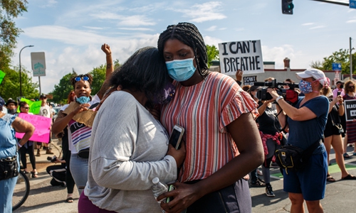 People hold signs and protest during a rally after a Minneapolis Police Department officer allegedly killed George Floyd on Tuesday in Minneapolis, Minnesota. A video of a handcuffed black man dying while a Minneapolis officer knelt on his neck for more than five minutes sparked fresh furor in the US over police treatment of African Americans. Photo: AFP