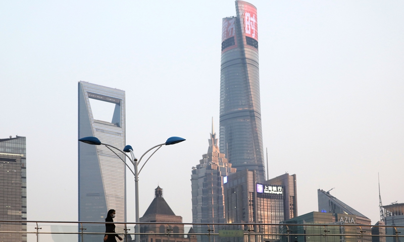 A resident walks through the overpass at Lujiazui area of Pudong, one of the influential financial centers in China. Photo: Yang Hui/GT