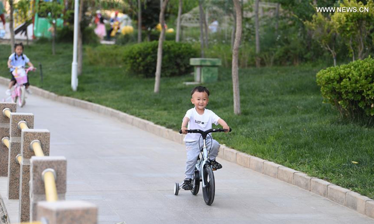 Children ride bikes at the Yuquan Lake Park in Hotan City, northwest China's Xinjiang Uygur Autonomous Region, May 28, 2020. Located to the south of the Taklimakan Desert, Hotan City has taken on a new look as the living environment is improved a lot with the modernization of infrastructure. (Xinhua/Sadat)