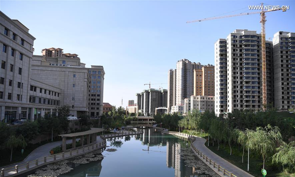 A view of Yuquan Lake Park is seen in Hotan City, northwest China's Xinjiang Uygur Autonomous Region, May 28, 2020. Located to the south of the Taklimakan Desert, Hotan City has taken on a new look as the living environment is improved a lot with the modernization of infrastructure. (Xinhua/Sadat)