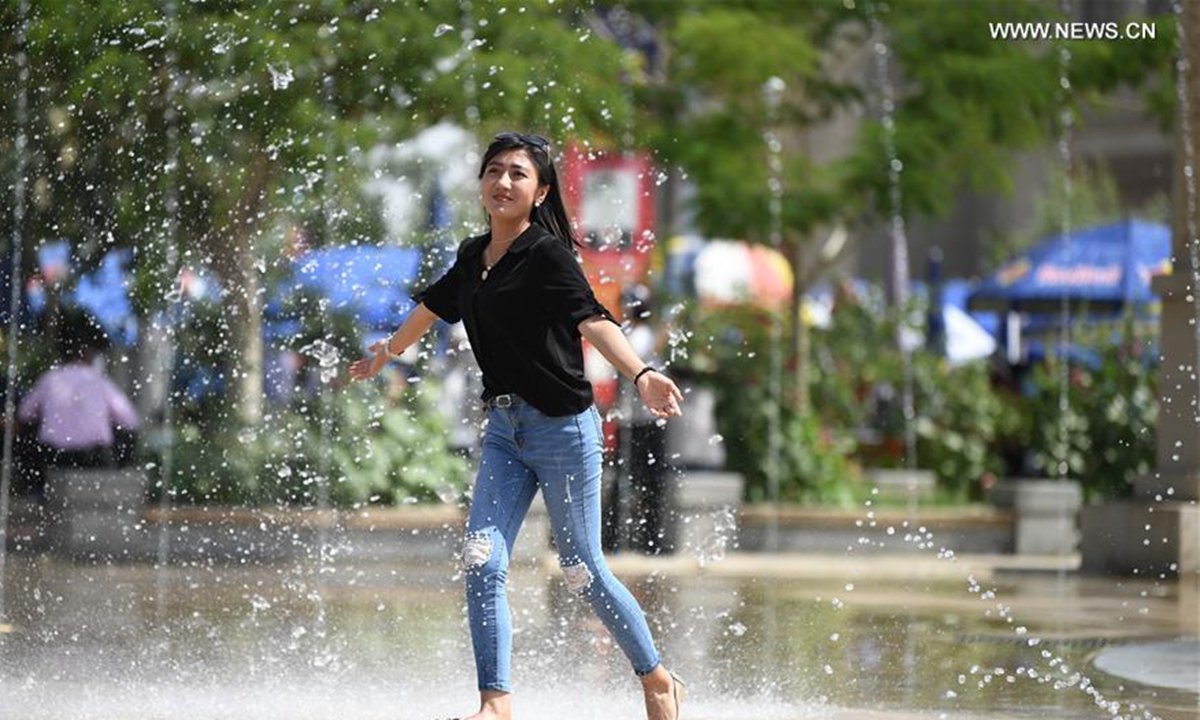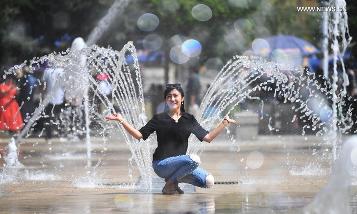 A girl relaxes at a fountain square in Hotan City, northwest China's Xinjiang Uygur Autonomous Region, May 27, 2020. Located to the south of the Taklimakan Desert, Hotan City has taken on a new look as the living environment is improved a lot with the modernization of infrastructure. (Xinhua/Sadat)