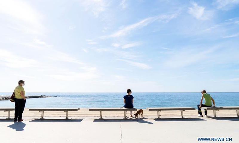 People keep social distancing at a beach during the COVID-19 pandemic in Barcelona, Spain, May 29, 2020. About 70 percent of Spain's population will enjoy further relaxation on restrictions in place to control the spread of COVID-19 as it enters Phase 2 of its restriction plans on Monday, the Spanish Ministry for Health, Consumer Affairs and Social Services said Wednesday. Phase 2 allows commercial centers, restaurants, cinemas and theaters, among other businesses, to open at a limited capacity. Outdoor exercise and access to beaches is also permitted, alongside social distancing guidelines.Photo:Xinhua