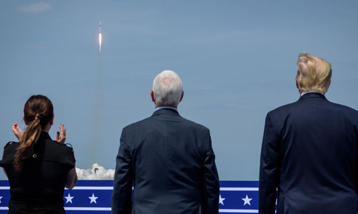 U.S. President Donald Trump (R), U.S. Vice President Mike Pence (C) watch the launch of SpaceX Falcon 9 rocket carrying the Crew Dragon spacecraft with two astronauts at NASA's Kennedy Space Center in Florida, the United States, May 30, 2020. (Bill Ingalls/NASA/Handout via Xinhua)
