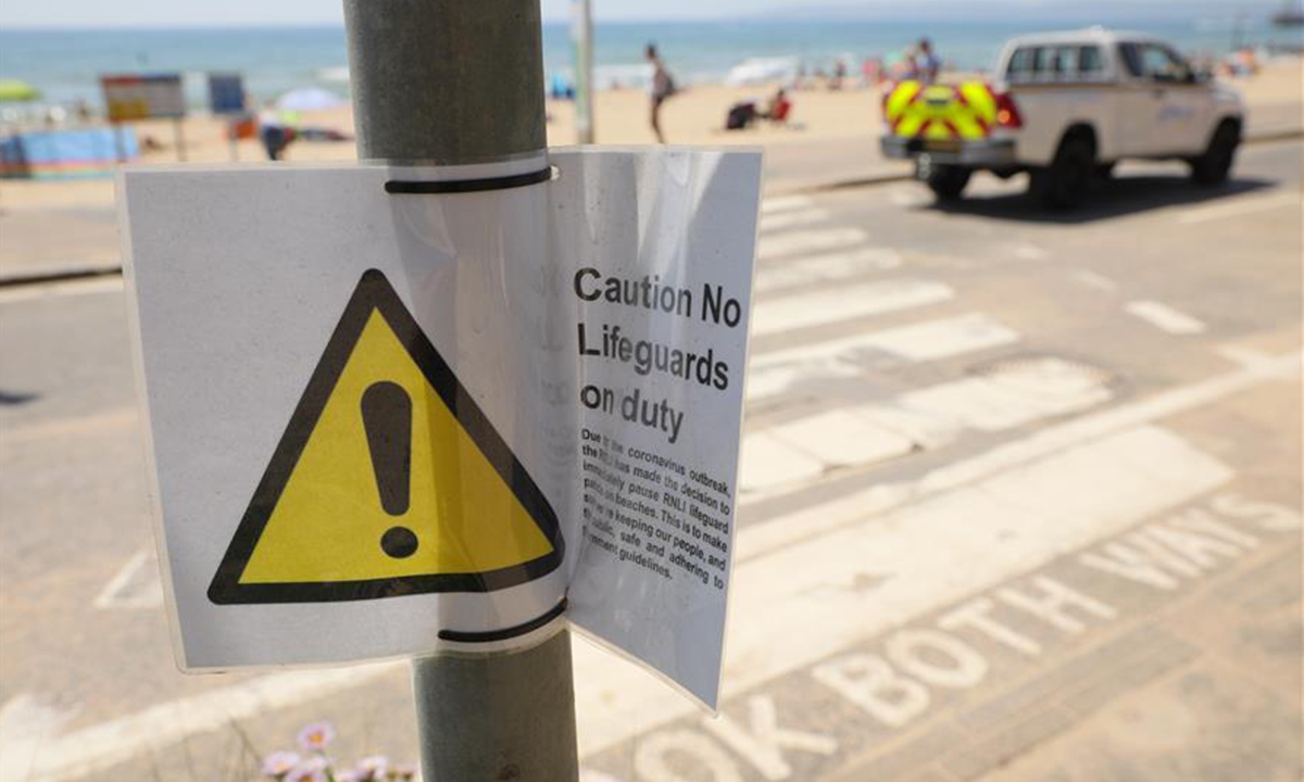 Photo taken on May 30, 2020 shows a sign warning that lifeguards are not on duty due to the coronavirus outbreak, at Bournemouth Beach in Bournemouth, Britain. British Prime Minister Boris Johnson on Thursday unveiled some "limited" and "cautious" easing of the country's coronavirus lockdown measures. (Photo by Tim Ireland/Xinhua)