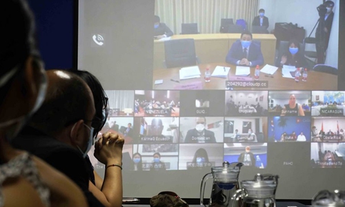 Photo taken on March 23, 2020 shows the venue of an online meeting on COVID-19 epidemic prevention and control among representatives from China and Latin American and Caribbean countries in San Salvador, El Salvador.(Photo by Alexander Pena/Xinhua)