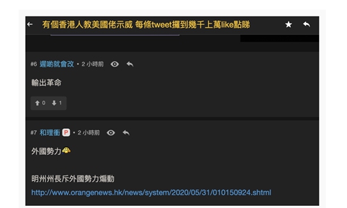 On the LIHKG forum website, which is used by large numbers of Hong Kong rioters, the sharing of "experience" with US protesters has been noticed by members themselves, with some calling it "transporting revolution," and some posting news links that said the "governor of Minnesota suspected the involvement of foreign forces in the chaos".