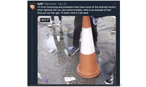 This is a tweet posted by a user named kylie⁷ on May 29 on the ongoing protests across the US caused by the death of George Floyd. The tweet contains a video featuring how Hong Kong rioters extinguish tear gas with an unknown liquid.