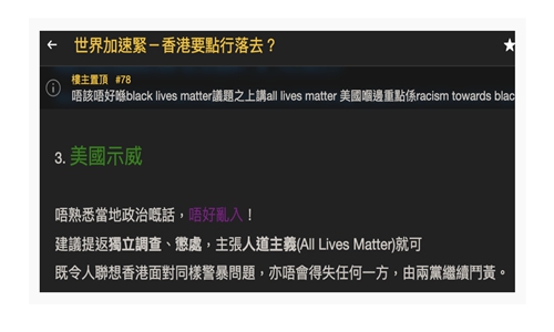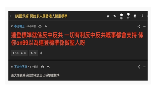 Some on the LIHKG forum did not seem to be ashamed of "adopting double standards on violent protests in the US," saying the "standard of LIHKG is anti-China and anti-Communist, and everything conducive to anti-China and anti-Communist will be supported. Do you think LIHKG's standard is to be a saint?"