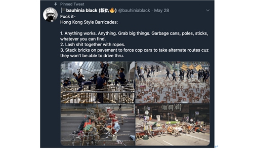 The Twitter account @hwaslintroller, who claims to be a user from Hong Kong, elaborated on tips, such as how to escape from police and offered advice on what to do after being arrested. Another Twitter user @bauhiniablack explained how to set up Hong Kong-style barricades with detailed instructions and diagrams.