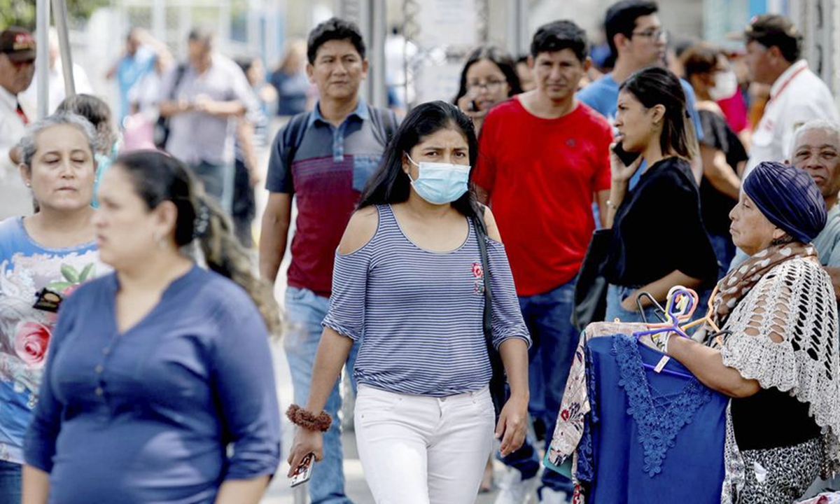 A woman wearing a face mask walks on a street in Lima, Peru, on March 6, 2020. (Xinhua/Renato Pajuelo/ANDINA)