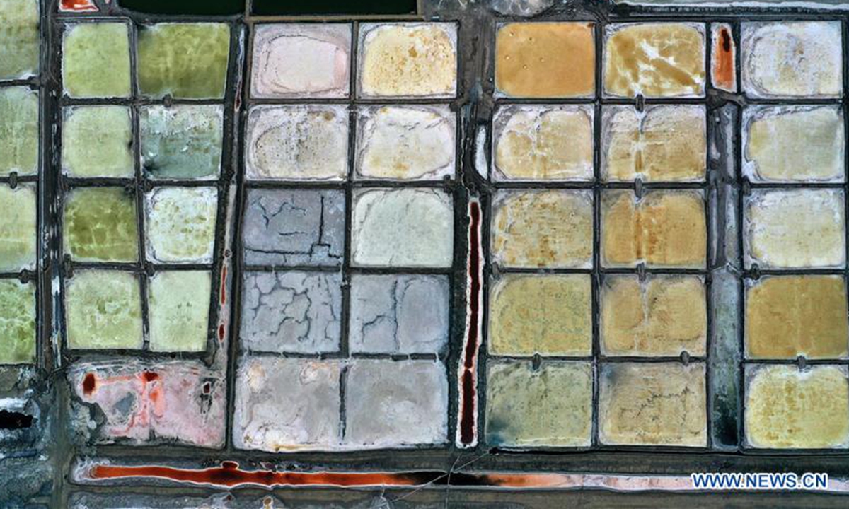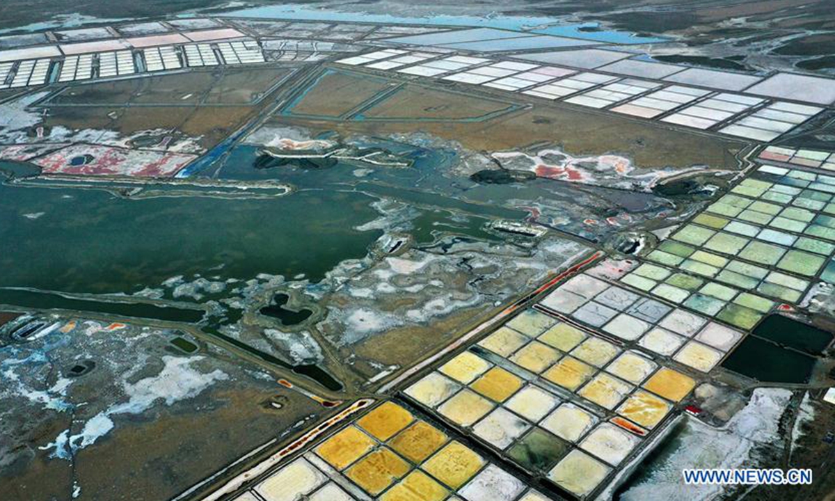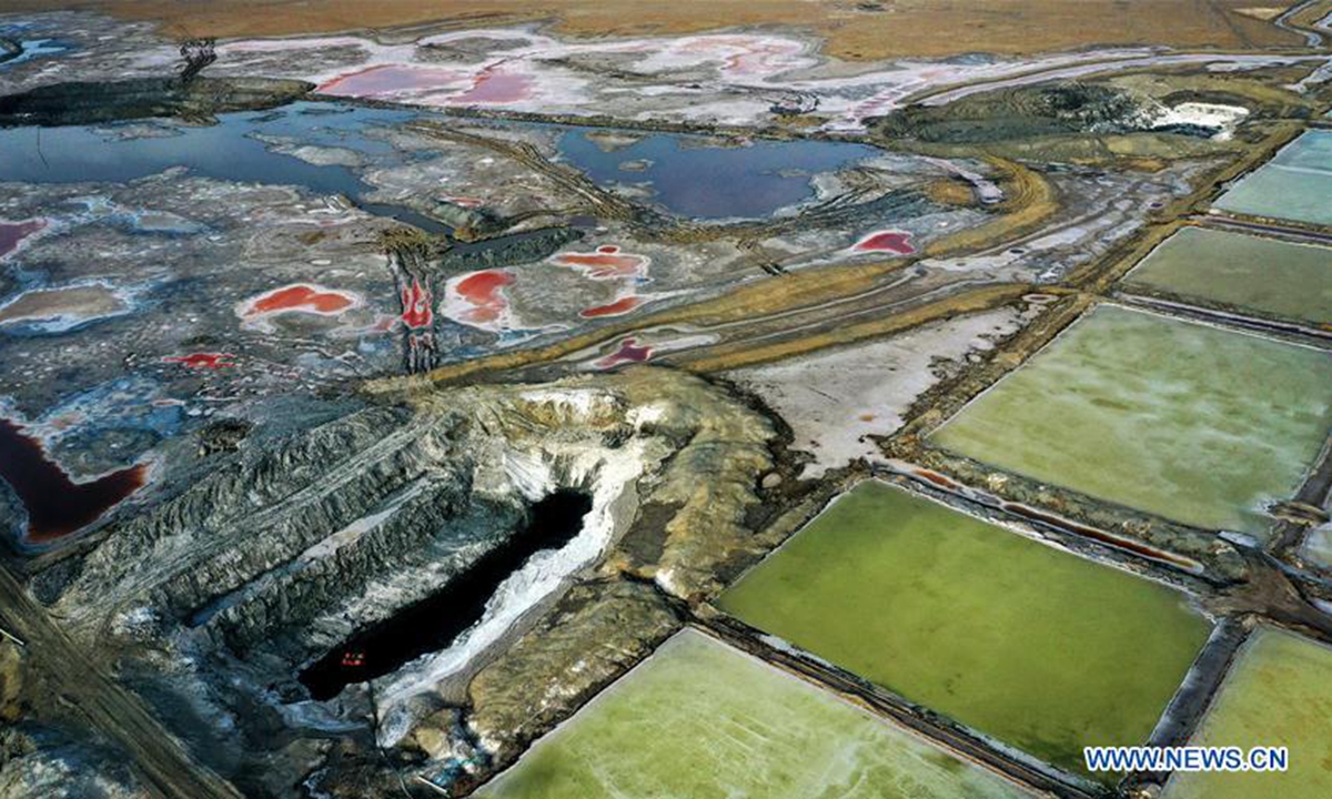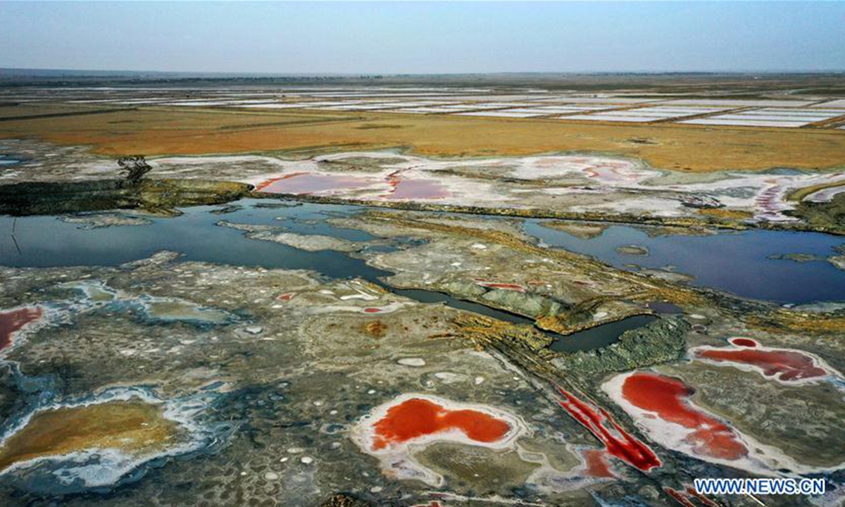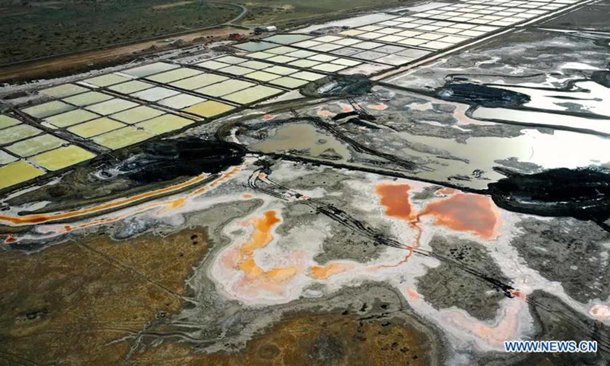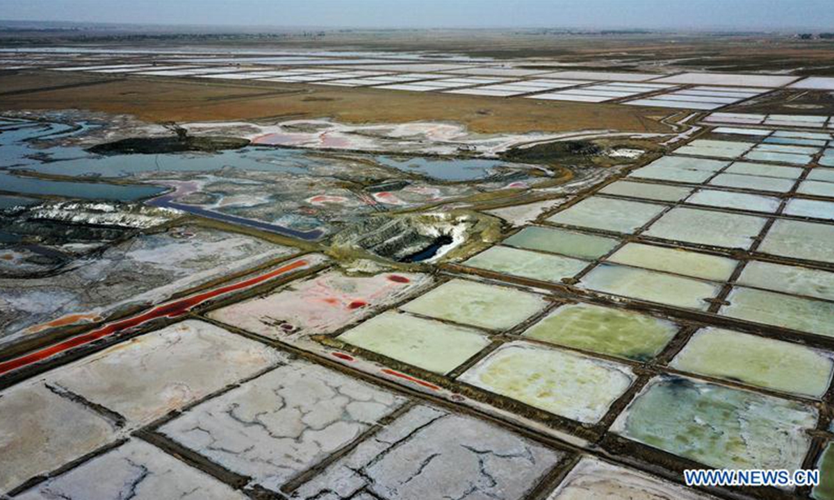 Aerial photo taken on May 31, 2020 shows Gouhu Lake, the biggest salt lake in Dingbian County, northwest China's Shaanxi Province. (Xinhua/Liu Xiao)