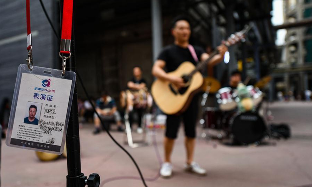 An artist with his performing certificate performs on a street in Chengdu, capital of southwest China's Sichuan Province, May 31, 2020. Street performance has returned in Chengdu amid the further containment of the novel coronavirus disease (COVID-19). (Xinhua/Wang Xi)