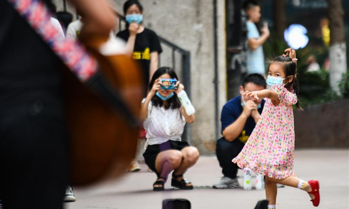 A child dances as an artist performs on a street in Chengdu, capital of southwest China's Sichuan Province, May 31, 2020. Street performance has returned in Chengdu amid the further containment of the novel coronavirus disease (COVID-19). (Xinhua/Wang Xi)