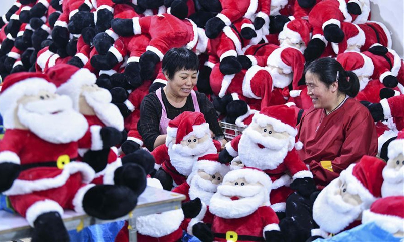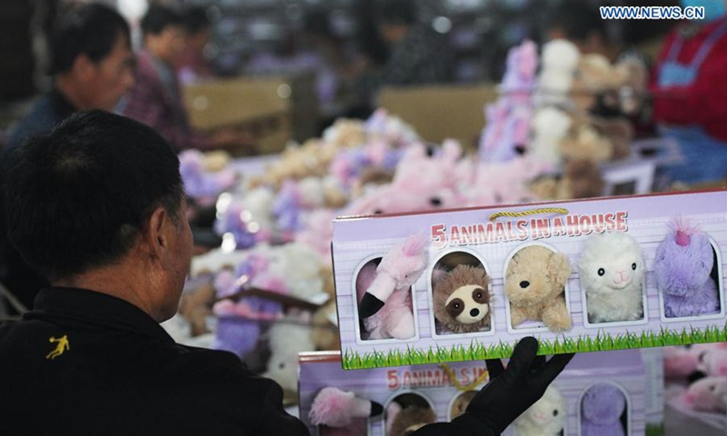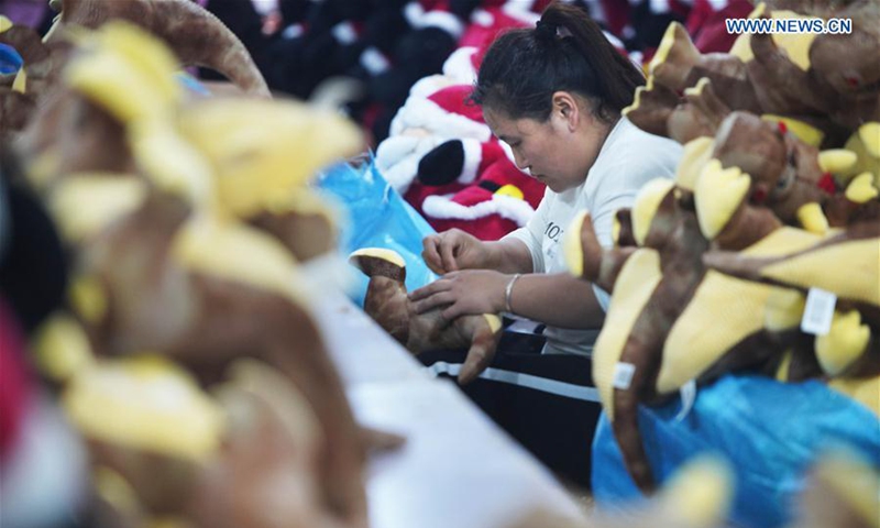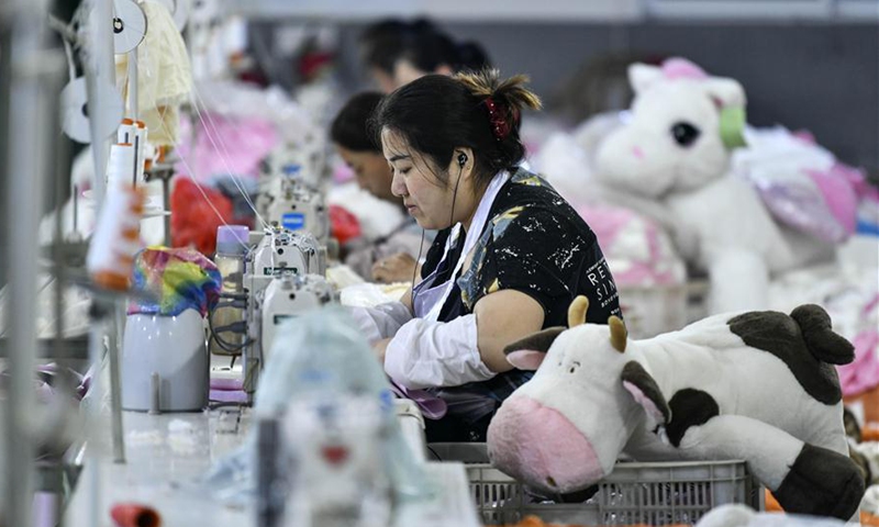 Workers make toys at a toy factory in Zaozhuang City, east China's Shandong Province, May 30, 2020. The factory offers more than 300 job posts for local women and poverty-stricken households. To date, it has exported toy products worth over two million U.S. dollars to the countries as United States, Germany and Sweden. (Xinhua/Fan Changguo)