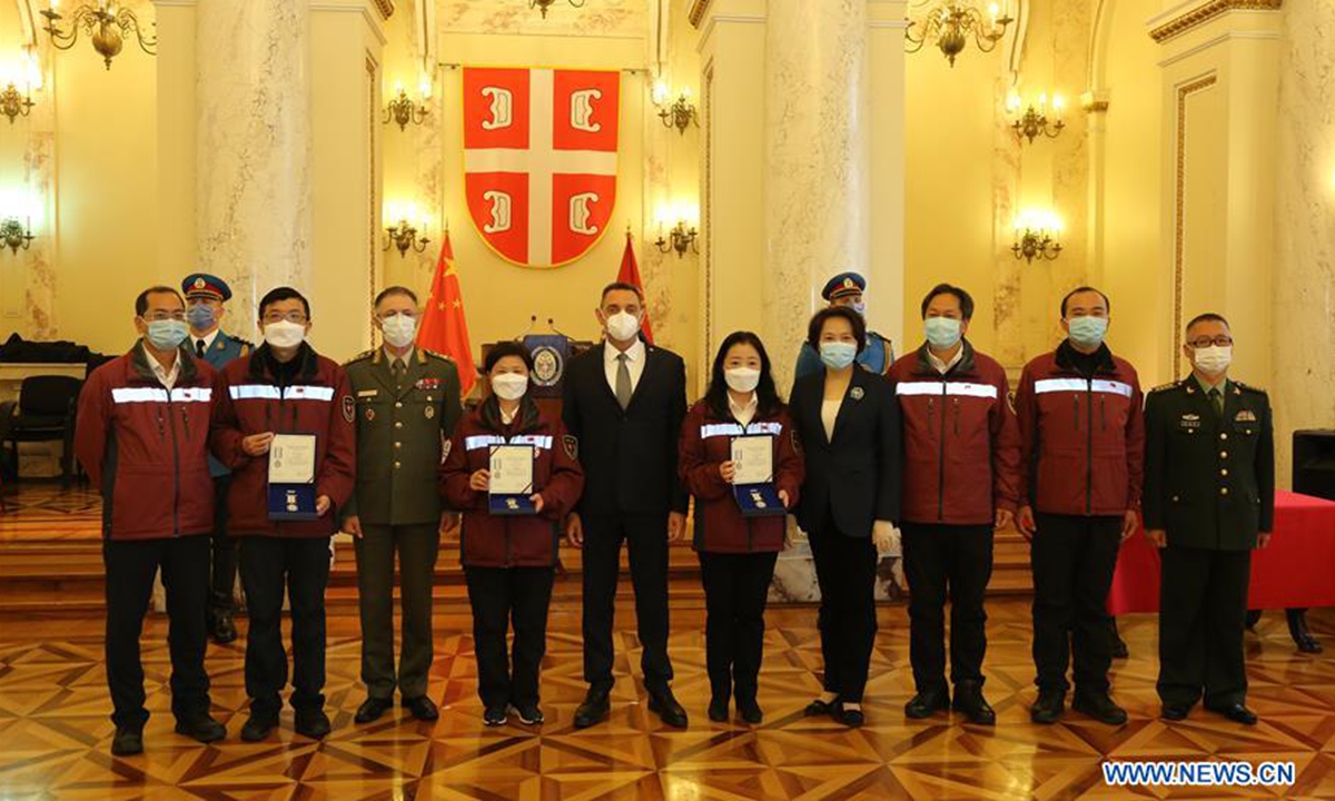Serbian Defense Minister Aleksandar Vulin (5th L) and Chinese Ambassador to Serbia Chen Bo (4th R) pose for a group photo with members of Chinese expert medical team during an award ceremony in Belgrade, Serbia, June 1, 2020. Another three members of a six-strong Chinese expert medical team to Serbia were awarded on Monday with military memorial medals for their assistance in fighting the COVID-19 pandemic. (Xinhua/Shi Zhongyu)