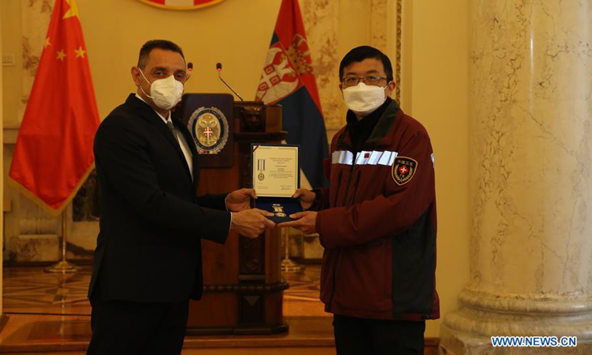 Serbian Defense Minister Aleksandar Vulin (L) awards a military memorial medal to Chinese expert medical team member Liu Dayue in Belgrade, Serbia, June 1, 2020. Another three members of a six-strong Chinese expert medical team to Serbia were awarded on Monday with military memorial medals for their assistance in fighting the COVID-19 pandemic. (Xinhua/Shi Zhongyu)