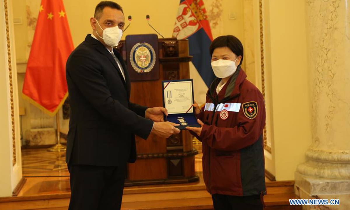 Serbian Defense Minister Aleksandar Vulin (L) awards a military memorial medal to Chinese expert medical team member Cheng Shouzhen in Belgrade, Serbia, June 1, 2020. Another three members of a six-strong Chinese expert medical team to Serbia were awarded on Monday with military memorial medals for their assistance in fighting the COVID-19 pandemic. (Xinhua/Shi Zhongyu)