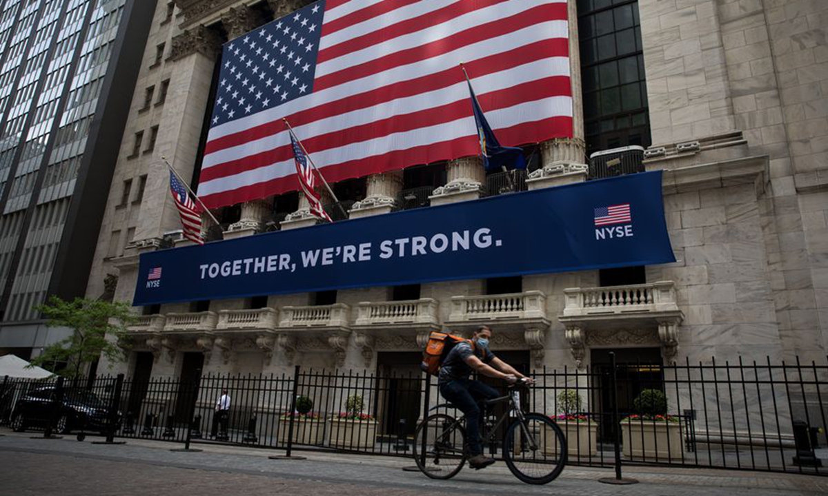 A delivery man wearing a face mask rides past the New York Stock Exchange (NYSE) in New York, the United States, May 27, 2020. (Photo by Michael Nagle/Xinhua)