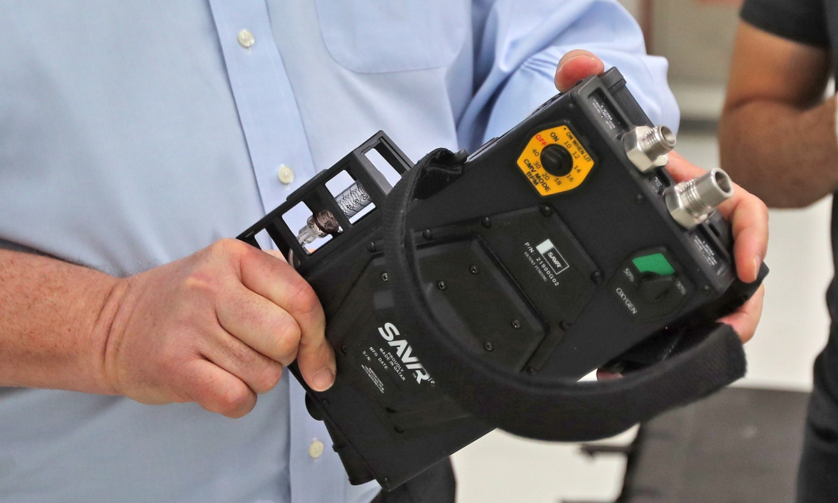 James W. Teetzel, CEO of American defense manufacturer Wilcox, holds a medical ventilator on May 4.