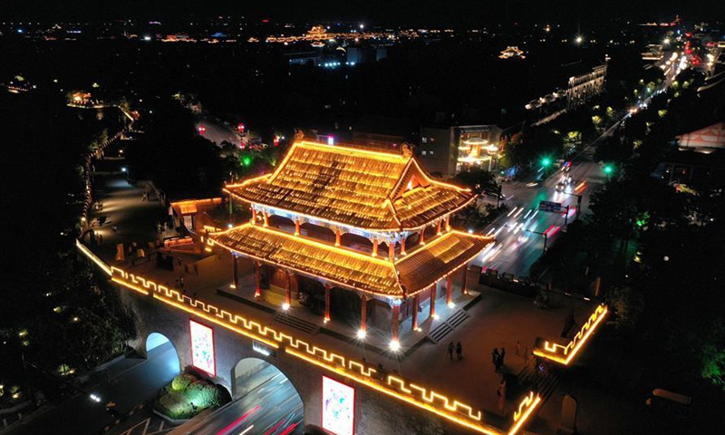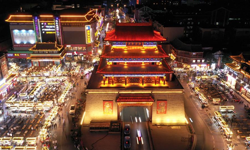 Aerial photo taken on June 1, 2020 shows the Daliang Gate illuminated at night in Kaifeng, central China's Henan Province. The night-time economy in Kaifeng has begun to revive as the city's evening businesses gradually reopen with the easing of COVID-19 restrictions. (Xinhua/Li An)