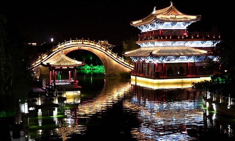 Photo taken on June 1, 2020 shows scenic illuminations along the waterways in Kaifeng, central China's Henan Province. The night-time economy in Kaifeng has begun to revive as the city's evening businesses gradually reopen with the easing of COVID-19 restrictions. (Xinhua/Li An)
