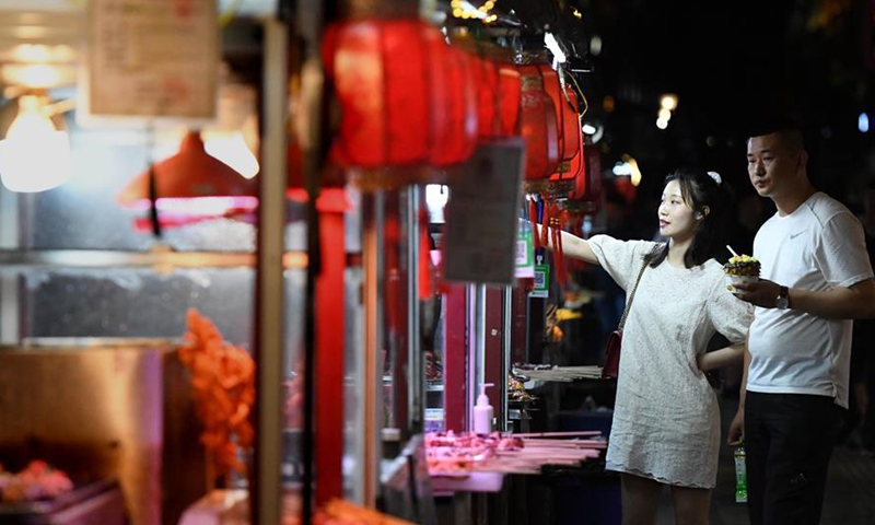 Tourists visit a food booth at a night market near the Drum Tower in Kaifeng, central China's Henan Province, June 1, 2020. The night-time economy in Kaifeng has begun to revive as the city's evening businesses gradually reopen with the easing of COVID-19 restrictions. (Xinhua/Li An)