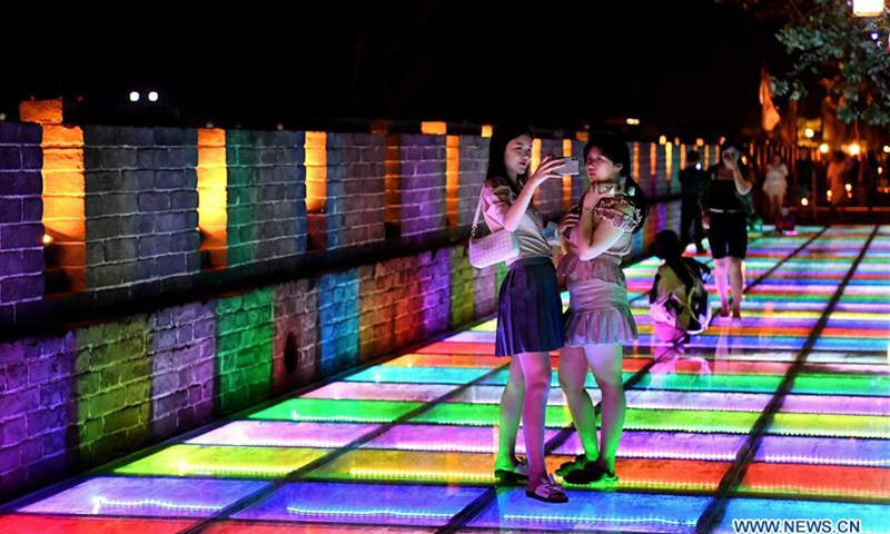 Two tourists pose for a selfie on a section of the ancient city wall in Kaifeng, central China's Henan Province, June 1, 2020. The night-time economy in Kaifeng has begun to revive as the city's evening businesses gradually reopen with the easing of COVID-19 restrictions. (Xinhua/Li An)