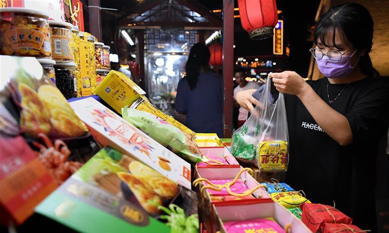 A tourist buys snacks at a night market near the Drum Tower in Kaifeng, central China's Henan Province, June 1, 2020. The night-time economy in Kaifeng has begun to revive as the city's evening businesses gradually reopen with the easing of COVID-19 restrictions. (Xinhua/Li An)