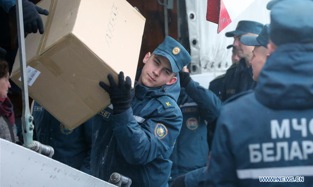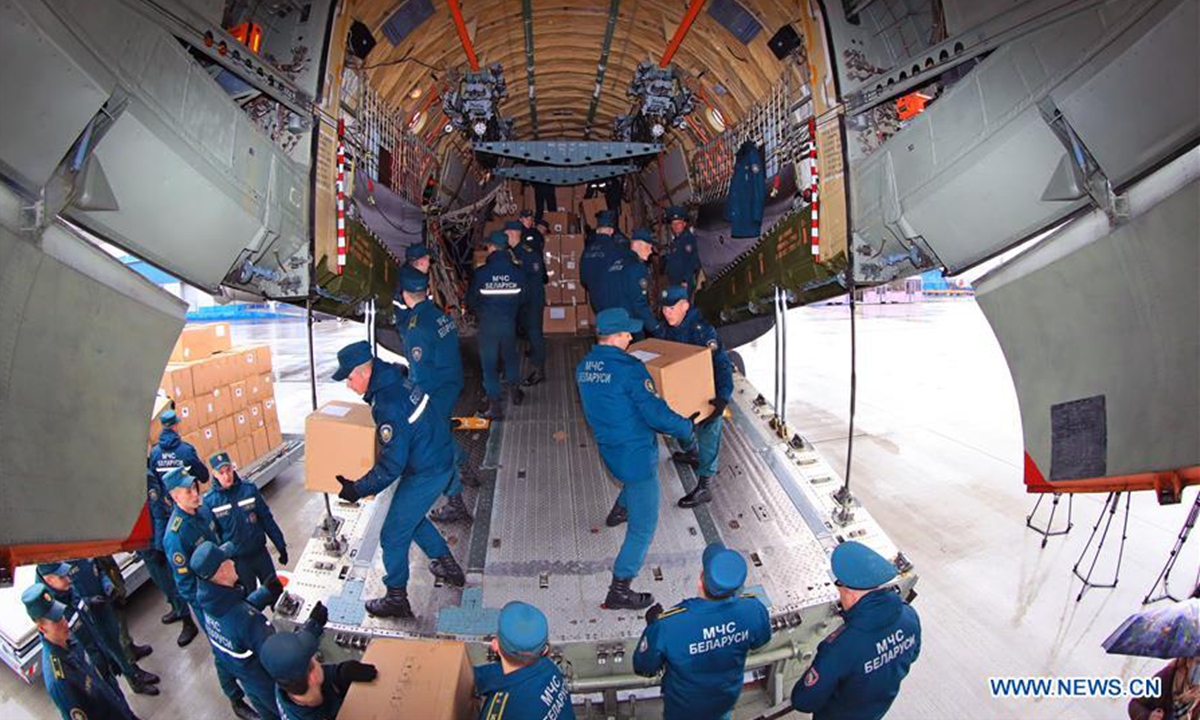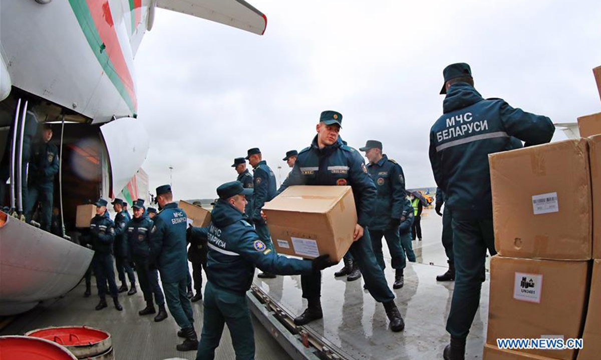 Soldiers unload medical supplies from China from a military aircraft at an airport in Minsk, Belarus, June 2, 2020. A fourth batch of Chinese humanitarian medical aid sent to Belarus arrived Tuesday, on board a military aircraft belonging to the Belarusian Defense Ministry. The 22 tons of cargo included non-contact thermometers, protective equipment, oxygen concentrators, test systems, and other medical products. More than 100 tons of humanitarian aid from China have now been delivered to Belarus on four flights. (Photo by Henadz Zhinkov/Xinhua)