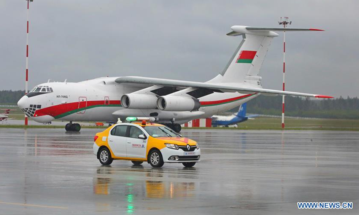 A military airplane carrying medical supplies from China arrives at an airport in Minsk, Belarus, June 2, 2020. A fourth batch of Chinese humanitarian medical aid sent to Belarus arrived Tuesday, on board a military aircraft belonging to the Belarusian Defense Ministry. The 22 tons of cargo included non-contact thermometers, protective equipment, oxygen concentrators, test systems, and other medical products. More than 100 tons of humanitarian aid from China have now been delivered to Belarus on four flights. (Photo by Henadz Zhinkov/Xinhua)