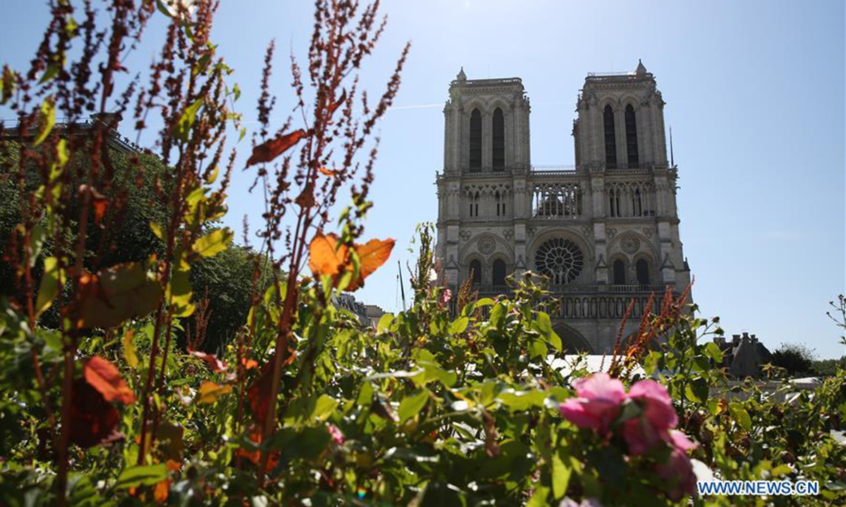 Flowers are seen in front of the Notre-Dame Cathedral in Paris, France, June 2, 2020. The Parvis Notre-Dame was reopened to the public from May 31 after more than one year's close because of the huge fire on April 15, 2019. (Xinhua/Gao Jing)