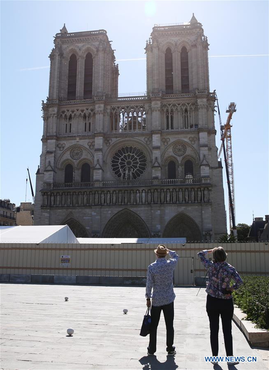 People visit the open space in front of the Notre-Dame Cathedral in Paris, France, June 2, 2020. The Parvis Notre-Dame was reopened to the public from May 31 after more than one year's close because of the huge fire on April 15, 2019. (Xinhua/Gao Jing)